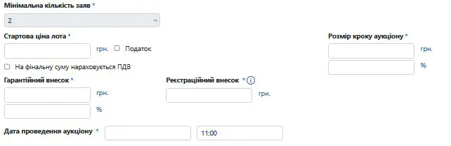 - Стартова ціна - ціна продажу лоту (визначається продавцем самостійно з врахуванням вимог Постанови).