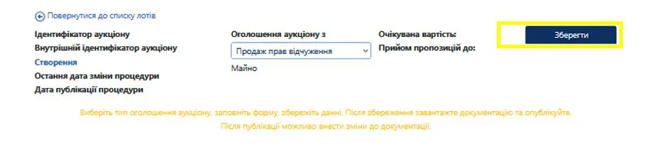 - Після завантаження документів натисніть кнопку «Опублікувати», аукціон буде опубліковано в електронній торговій системі.