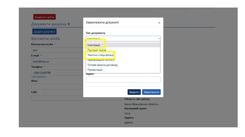 - Телефон – потрібно вказати номер телефону контактної особи. Він буде відображатися у опублікованих аукціонах та слугуватиме для зв’язку з організатором.