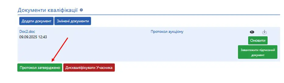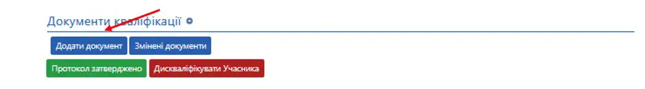 Для того щоб опублікувати підписаний протокол, на сторінці аукціону спустіться донизу в розділ Кваліфікація та натисніть кнопку «Додати документ».