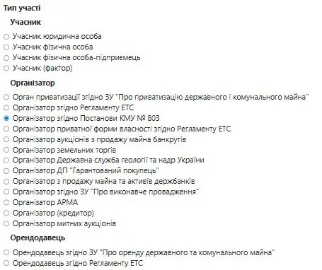 У вкладці «Учасник» Вам потрібно обрати тип участі «Організатор згідно Постанови КМУ № 803»