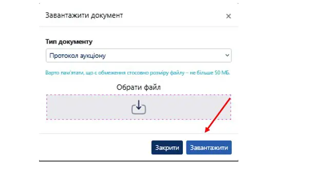 Після натискання кнопки у Вас з’явиться діалогове вікно для завантаження. Тип документу за замовчуванням Протокол аукціону. Оберіть необхідний Вам файл та натисніть кнопку «Завантажити».