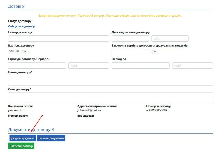 Через кнопку «Додати документ» оберіть файл договору та завантажте його під типом Підписаний договір.