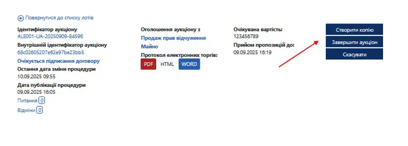 Після підтвердження у Вас з’явиться можливість завершити аукціон.