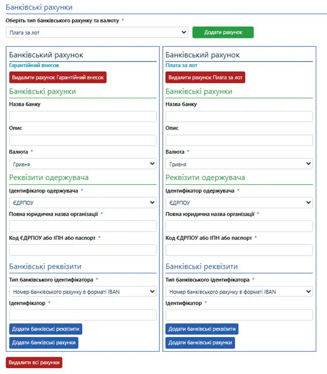 В блоці рахунків потрібно буде заповнити всі обов’язкові поля (позначені зірочкою). Дані рахунки будуть автоматично підтягуватись при формуванні Вами аукціону.