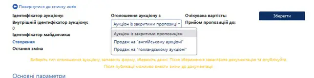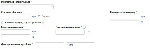 - Дата проведення аукціону - визначається організатором самостійно. Мінімальний термін від дати публікації до аукціону 7 календарних днів.