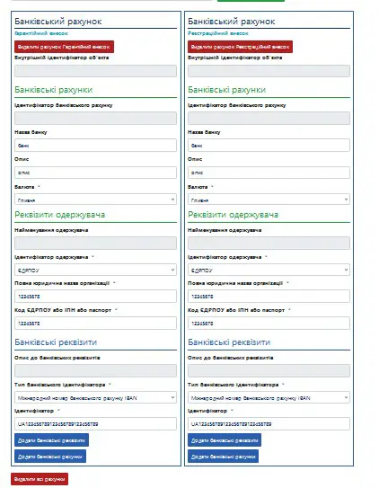В блоці рахунків потрібно буде заповнити всі обов’язкові поля (позначені зірочкою). Дані рахунки будуть автоматично підтягуватись при формуванні Вами аукціону.