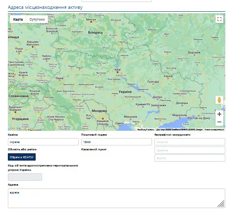 У розділі необхідно вказати точну адресу місцезнаходження лоту. Вкажіть Код об’єктів адміністративно-територіального устрою України та оберіть місце розташування об’єкта на карті (адреса та координати підтягнуться автоматично).