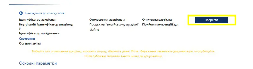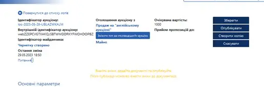 - Після завантаження документів натисніть кнопку «Опублікувати», аукціон буде опубліковано в електронній торговій системі.