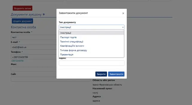 - Телефон – потрібно вказати номер телефону контактної особи. Він буде відображатися у опублікованих аукціонах та слугуватиме для зв’язку з організатором.