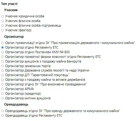 У вкладці «Учасник» Вам потрібно обрати тип участі «Організатор згідно Регламенту ЕТС»