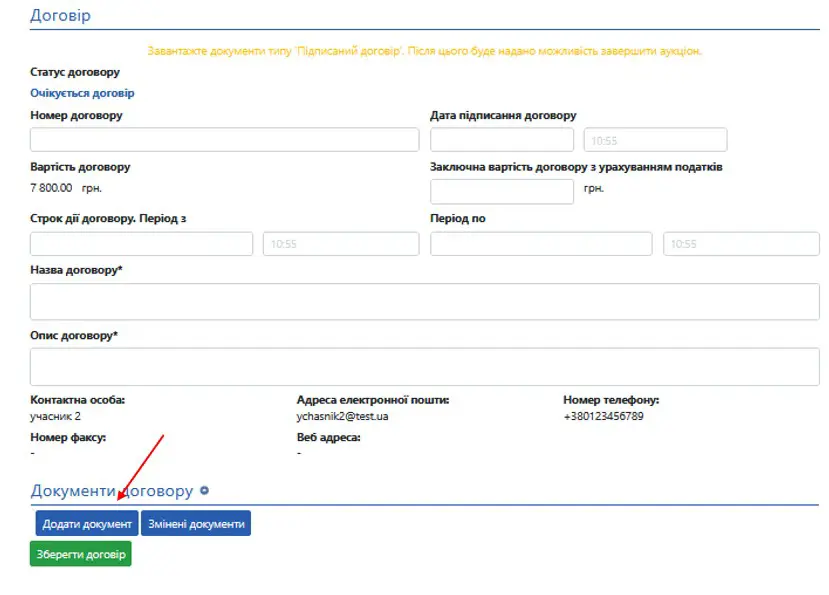 Через кнопку «Додати документ» оберіть файл договору та завантажте його під типом Підписаний договір.