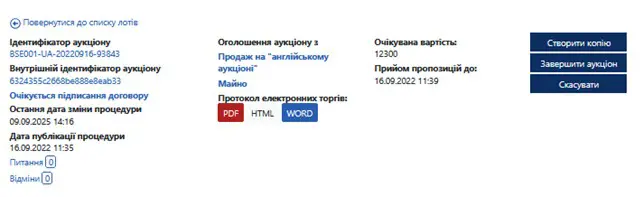 Після підтвердження у Вас з’явиться можливість завершити аукціон.