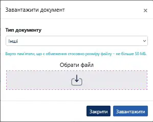 після чого, натиснути кнопку «Додати документ», обрати тип файлу «Інші», обрати необхідний файл на комп’ютері та, натиснувши кнопку «Завантажити», додати необхідний документ для ідентифікації організатора згідно Регламенту ЕТС (сканована копія підписаного договору з майданчиком).