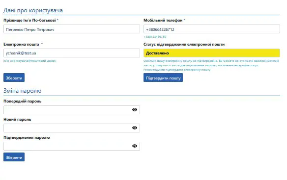 Додатково тут є поле Статус підтвердження електронної пошти. Для коректного отримання повідомлень від майданчика прохання натиснути кнопку «Підтвердити пошту» та слідувати інструкціям у листі, який прийде Вам на електронну пошту, яку Ви вказували при реєстрації.