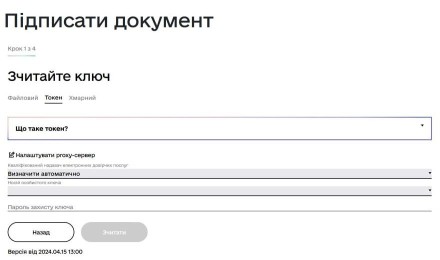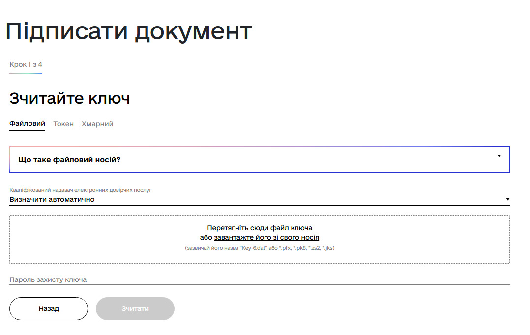 Якщо це апаратний ключ(токен), то вводимо тільки пароль і натискаємо «зчитати»