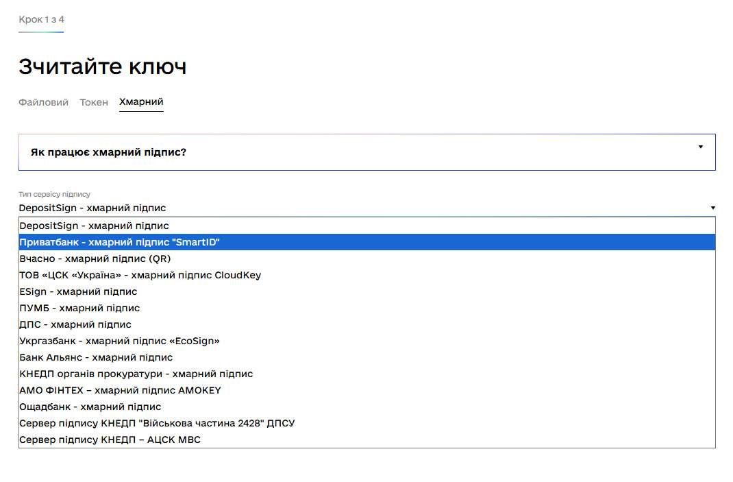 Крок 2. Обираємо тип сервісу, яким було видано ключ