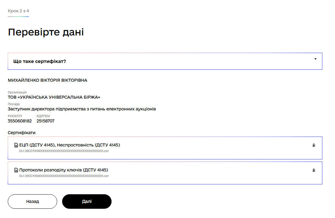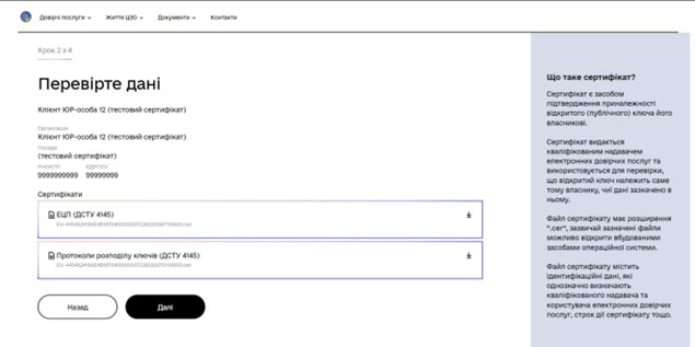 В цьому кроці можемо ознайомитись з інформацією про підписанта. Після перевірки даних ключа натискаємо клавішу «Далі»