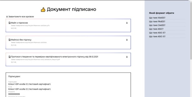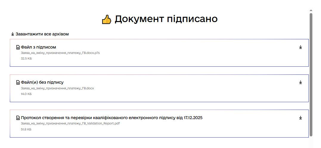 Коли документ підписано, обираємо «Файл з підписом» та завантажуємо на комп’ютер. Також можна переглянути файл без підпису.