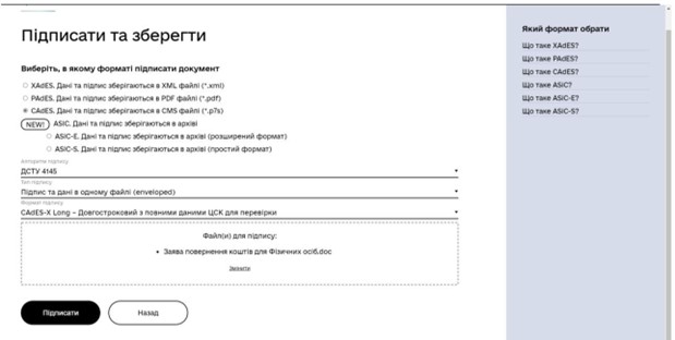 Потім обираємо формат CAdES. Дані та підпис зберігаються в CMS файлі (*.p7s). додаємо файл який буде підписуватись, та натискаємо клавішу «Підписати»