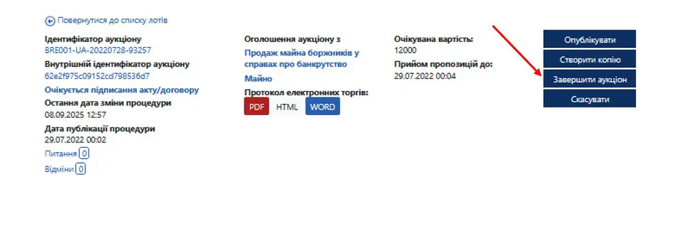 Після підтвердження у Вас з’явиться можливість завершити аукціон.