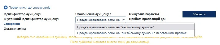 - З випадаючого списку «Оголошення аукціону з» оберіть: «Продаж арештованої землі на «англійському аукціоні» або «Продаж арештованої землі на «англійському аукціоні» з переважним правом» в залежності від типу ваших торгів.