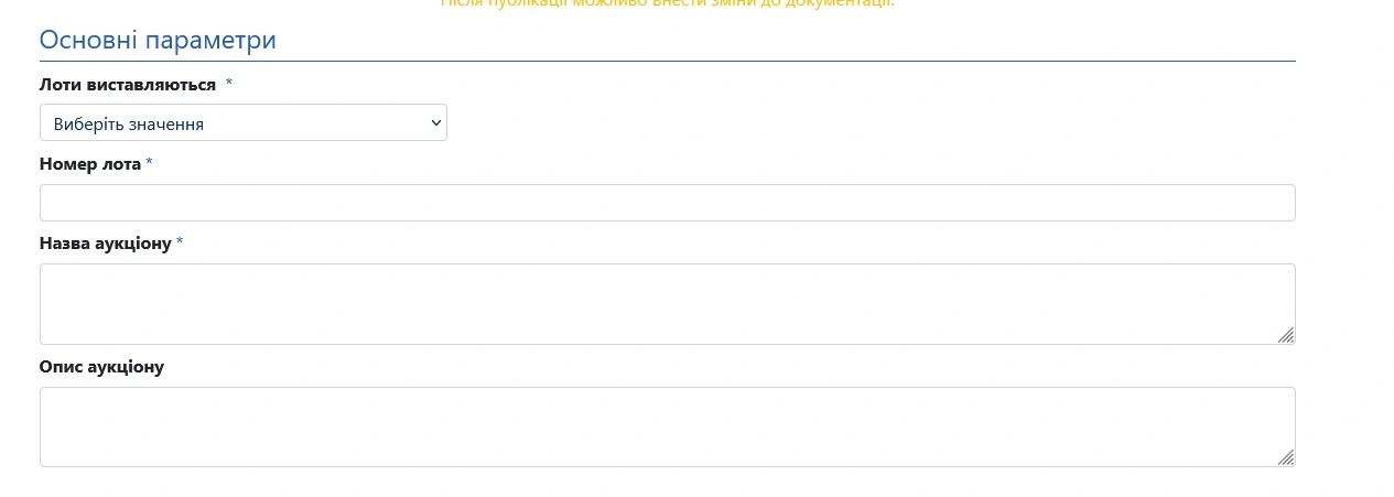 - У вас відкрилась чернетка електронного аукціону, де перед тим як публікувати його в електронну торгову систему, у Вас буде можливість внести необхідні дані, які повинні відповідати вимогам законодавства та електронної торгової системи.