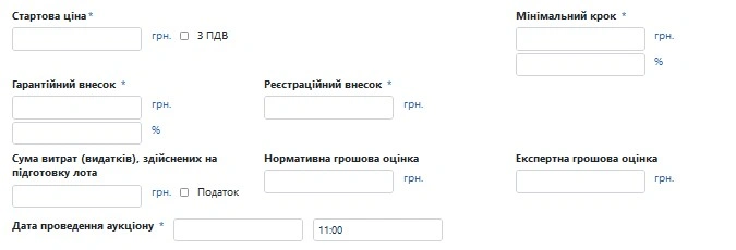 - Нормативна грошова оцінка та Експертна грошова оцінка - прописуються в залежності від того, яка саме оцінка проводилась для торгів, інше поле може залишатися пустим.