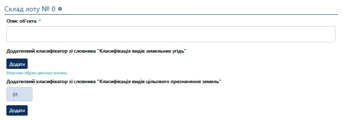 - Додатковий класифікатор зі словника "Класифікація видів земельних угідь" - обирається замовником з переліку (можна обрати кілька значень).