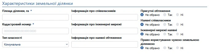 - Обтяження прав на земельну ділянку, обмеження у використанні земель - вказується замовником (поле не обов’язкове).