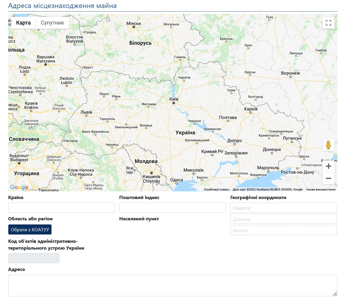 - У розділі необхідно вказати точну адресу об’єкта оренди. Вкажіть Код об’єктів адміністративно-територіального устрою України та оберіть місце розташування об’єкта на карті (адреса та координати підтягнуться автоматично).