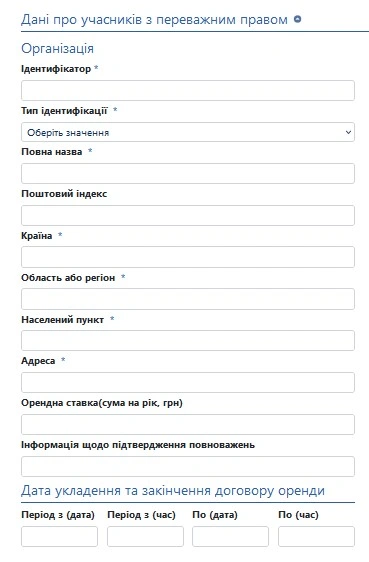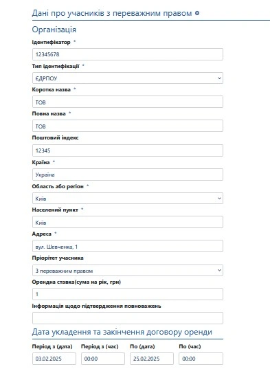 - У випадку земельних торгів з продажу земельної ділянки з переважним правом додатково заповнюється блок Дані про учасників з переважним правом: