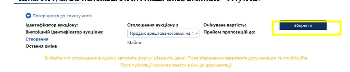 - Після завантаження документів натисніть кнопку «Опублікувати», аукціон буде опубліковано в електронній торговій системі.