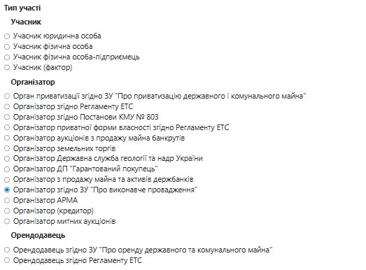 У вкладці «Учасник» Вам потрібно обрати тип участі «Організатор згідно ЗУ "Про виконавче провадження"»