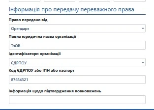 В блоці Інформація про передачу переважного права необхідно вказати дані чинного орендаря або надрокористувача, від якого було передано переважне право.