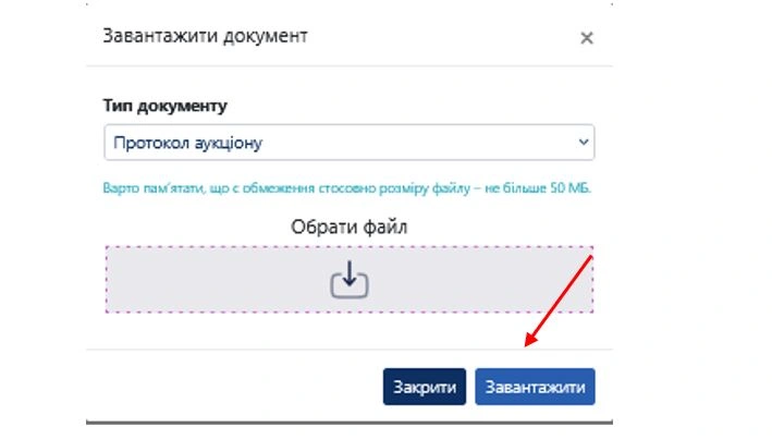 Після натискання кнопки у Вас з’явиться діалогове вікно для завантаження. Тип документу за замовчуванням Протокол аукціону. Оберіть необхідний Вам файл та натисніть кнопку «Завантажити».
