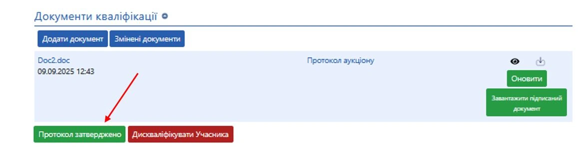 Після завантаження документу натисніть кнопку «Протокол затверджено», статус аукціону автоматично перейде в Очікується підписання договору.