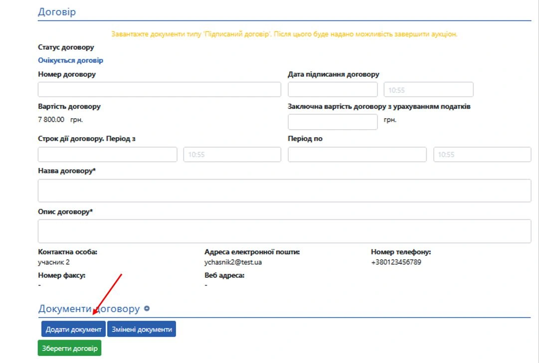 Після заповнення полів через кнопку «Додати документ» потрібно додати файл договору під типом «Підписаний Акт/договір» та натиснути кнопку «Зберегти договір».