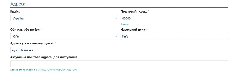 - Оbбласть або регіон – з випадаючого списку потрібно обрати область