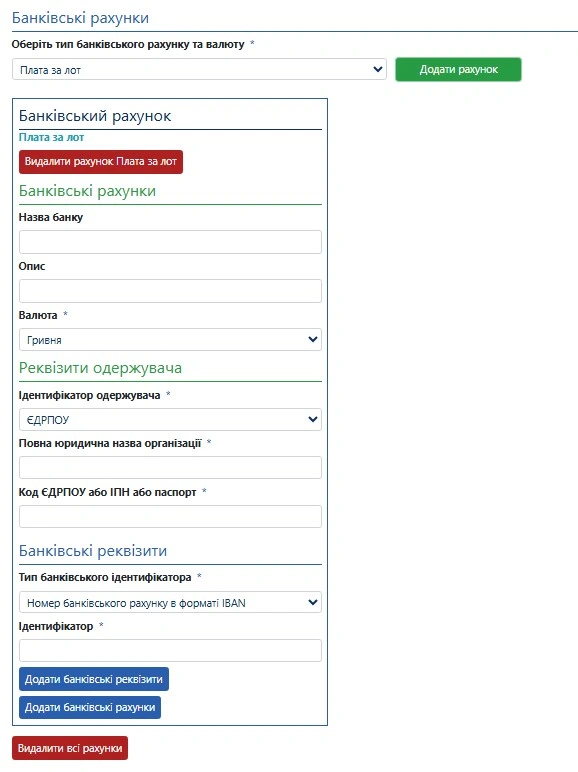 В блоці рахунків потрібно буде заповнити всі обов’язкові поля (позначені зірочкою). Даний рахунок буде автоматично підтягуватись при формуванні Вами аукціону.