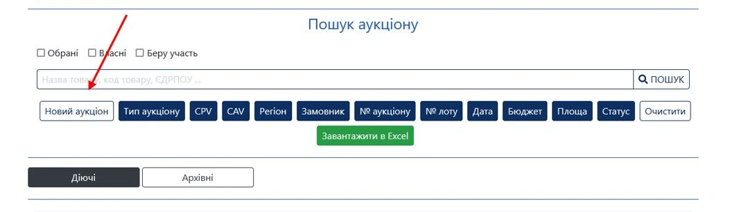 - Перейдіть в вкладку «Аукціони» та натисніть кнопку «Новий аукціон».
