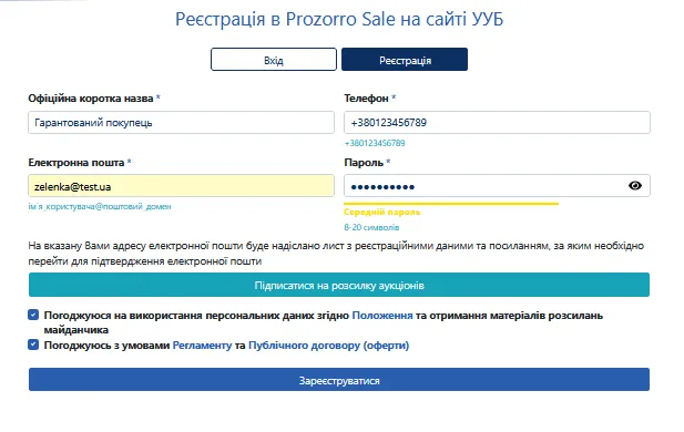 Для того щоб створювати аукціони з відчуження державного майна потрібно зареєструватися на майданчику.
