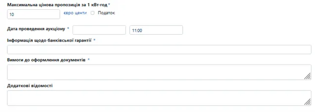 - Максимальна цінова пропозиція за 1 кВт⋅год - стартова ціна аукціону, зазначається організатором, згідно вимог законодавства.