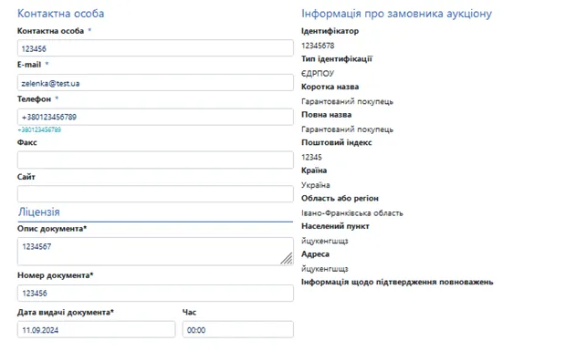 - Контактна інформація та Інформація про замовника аукціону - інформація підтягнеться автоматично з особистого кабінету. Інформацію, щодо контактної особи можна редагувати окремо по кожному аукціону.