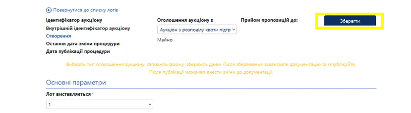 - На сторінці чернетки аукціону «Оголошення аукціону з…» автоматично обрано «Аукціон з розподілу квоти підтримки».