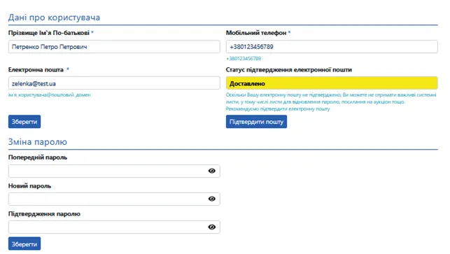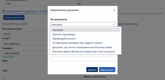- Телефон – потрібно вказати номер телефону контактної особи. Він буде відображатися у опублікованих аукціонах та слугуватиме для зв’язку з організатором.