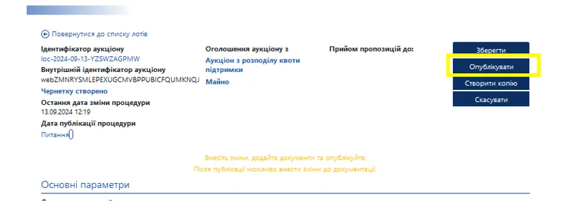 Після завантаження документів натисніть кнопку «Опублікувати», аукціон буде опубліковано в електронній торговій системі.