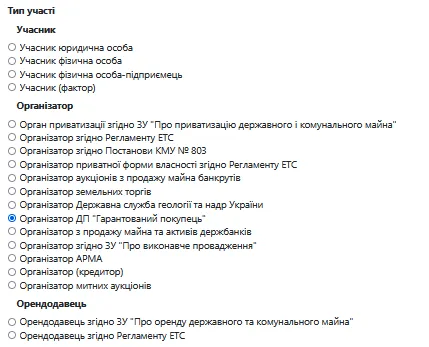 У вкладці «Учасник» Вам потрібно обрати тип участі «Організатор ДП "Гарантований покупець"»