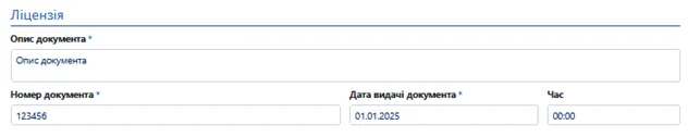 - Дата видачі документа – дата видачі ліцензії в форматі 01.01.2025 та час в форматі 08:00