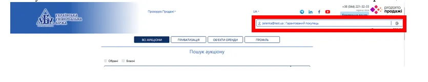 - Просимо перевірити чи дійсно Ви авторизовані на майданчику (увійшли до свого особистого кабінет за допомогою логіну та паролю). Важливо пам’ятати, роботу в аукціонах ви можете виконувати тільки після авторизації.